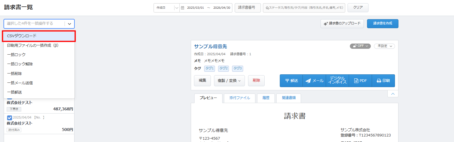- 「請求書のアップロード」機能でアップロードした請求書は、PDF出力・印刷・印刷用ファイルの一括作成はできません。