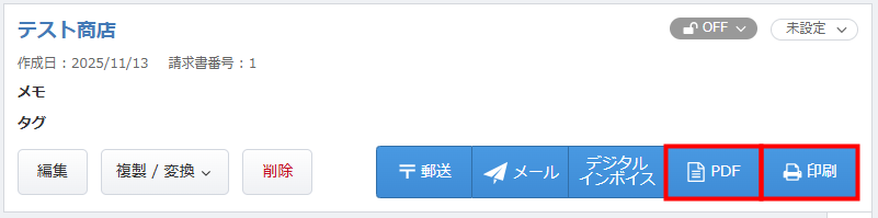 「PDF」または「印刷」のボタンをクリックすると、作成した帳票のPDFファイルをダウンロードできます。