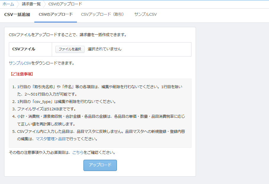 「CSVのアップロード」画面では、CSVファイルをアップロードして複数の帳票を一括作成できます。