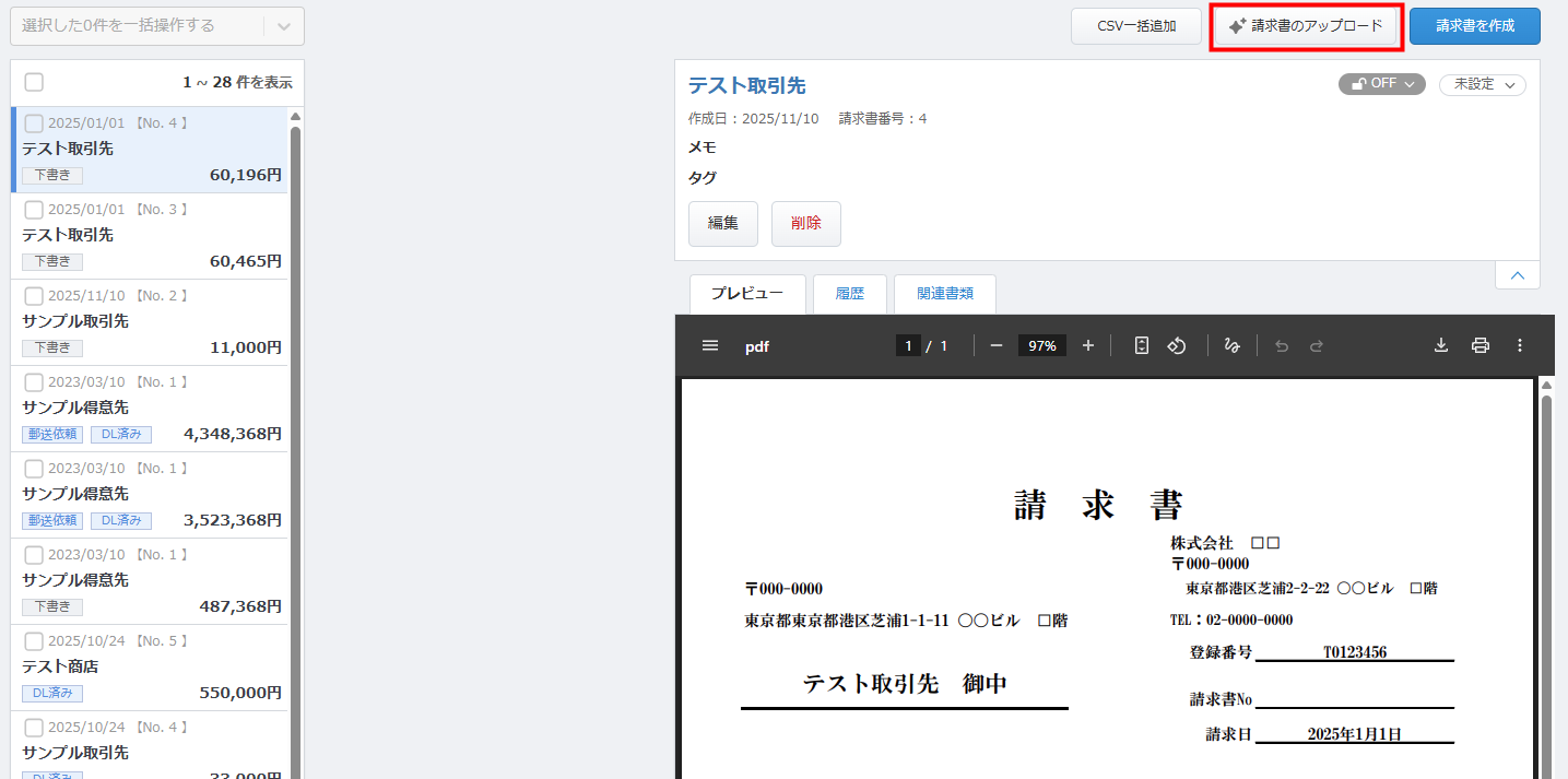 - アップロードした請求書は、「複製・変換」「郵送代行」「メール送信」「デジタルインボイスの送信」「PDFファイルの出力」機能を利用できません。