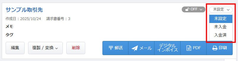 | 請求書 | 未入金 入金済み | まだ入金されていない状態です。 入金が完了している状態です。 |
