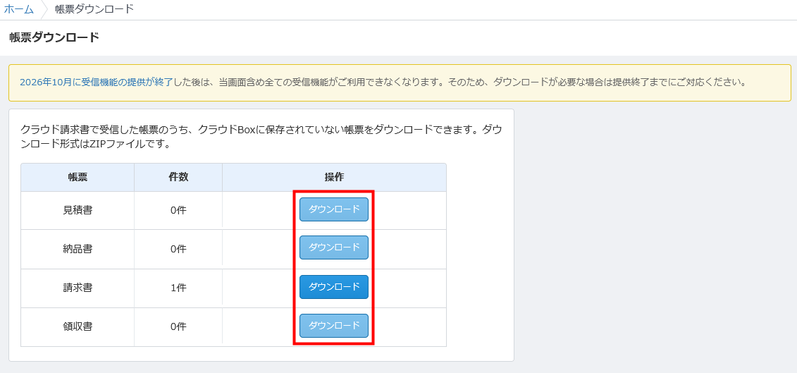 - 2026年10月に予定されている「受信」機能の提供終了後は、「受信」機能のすべての操作が行えなくなります。ダウンロードが必要な場合は、提供終了までにご対応ください。