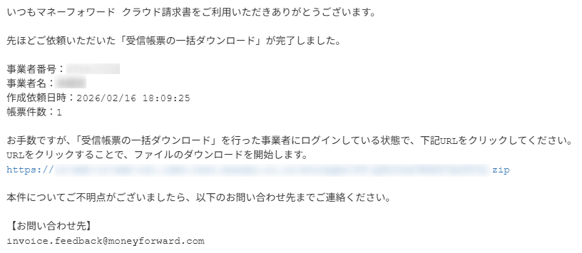 - 「【マネーフォワード クラウド請求書】 受信帳票の一括ダウンロードの準備ができました」という件名のメールを確認し、本文に記載されているURLをクリックします。