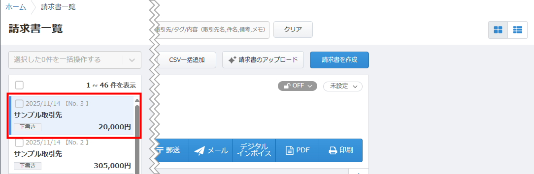 - 「請求書一覧」画面で複製する請求書を選択します。