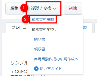 - 「複製 / 変換」をクリックし、「請求書を複製」を選択します。
