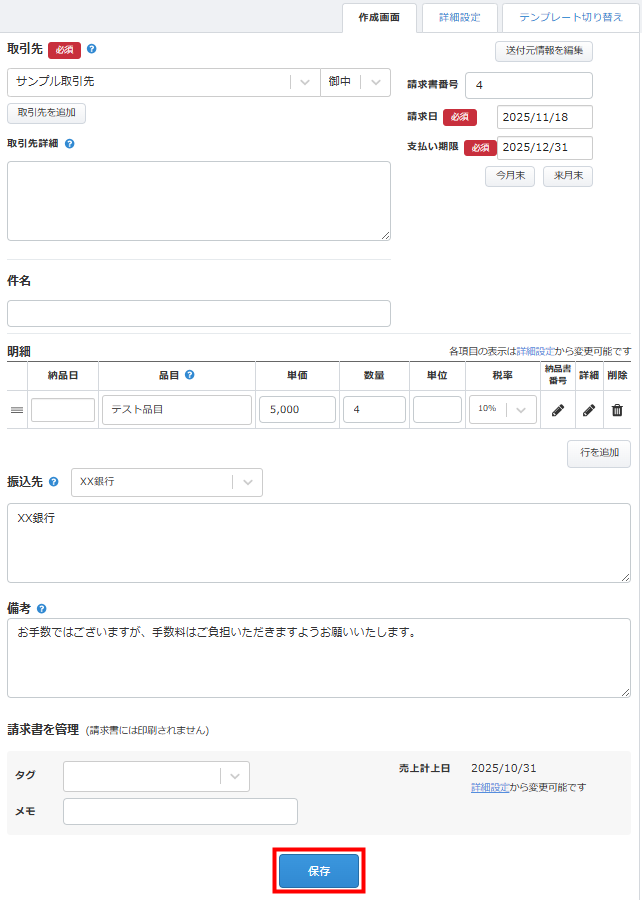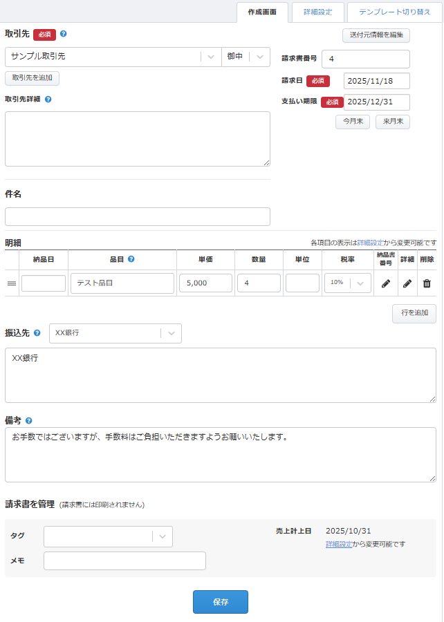 - 複製された請求書の内容を確認し、必要に応じて品目などを編集します。