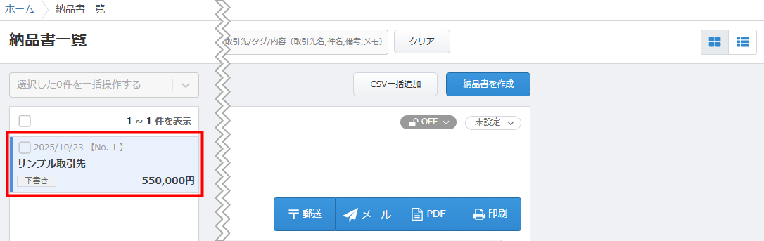 - 「納品書一覧」画面で変換する納品書を選択します。