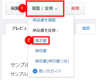 - 「複製 / 変換」をクリックし、「請求書」を選択します。