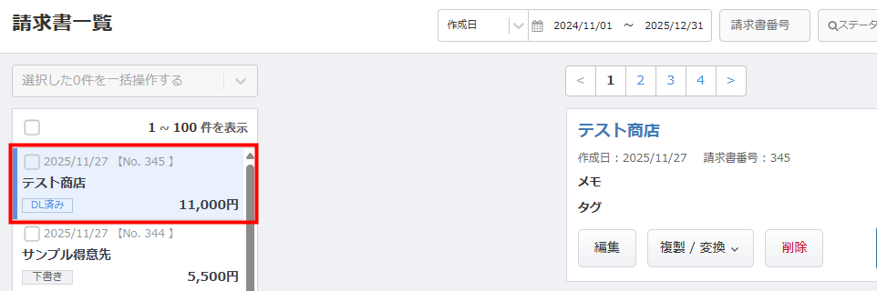 「請求書一覧」画面で作成された請求書を確認してください。 - 「請求日」と「作成日」は同一の日付が設定されます。「作成日」以外の日付は指定できません。