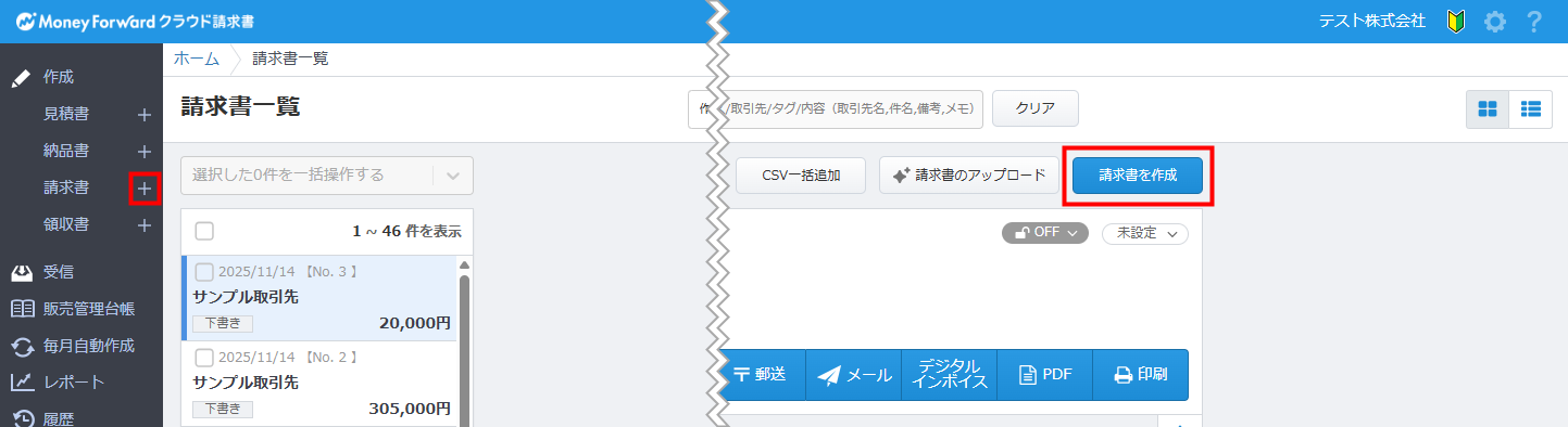 2. 請求書一覧」画面を開き、画面左の「請求書」メニューの横にある「+」か、「請求書を作成」ボタンをクリックします。