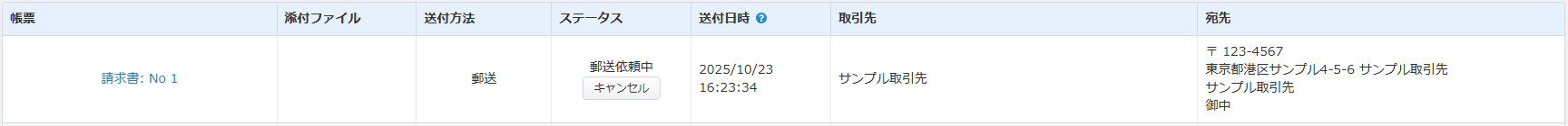 「郵送依頼中」ステータスの帳票は、郵送を依頼している状態です。