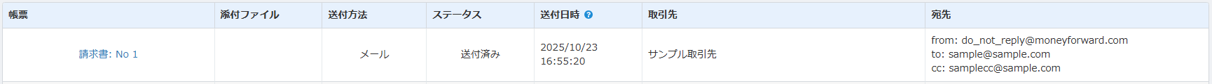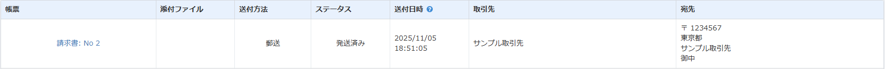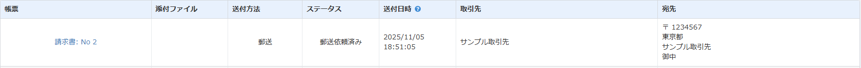 「発送済み」ステータスの帳票は、郵送代行会社による発送作業が完了している状態です。