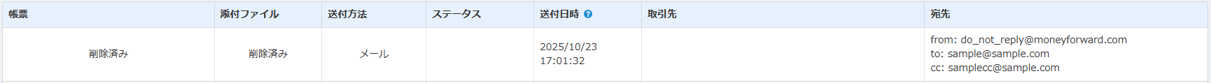 「帳票」欄に「削除済み」と表示されている帳票は、メール送信した帳票のデータが削除されている状態です。