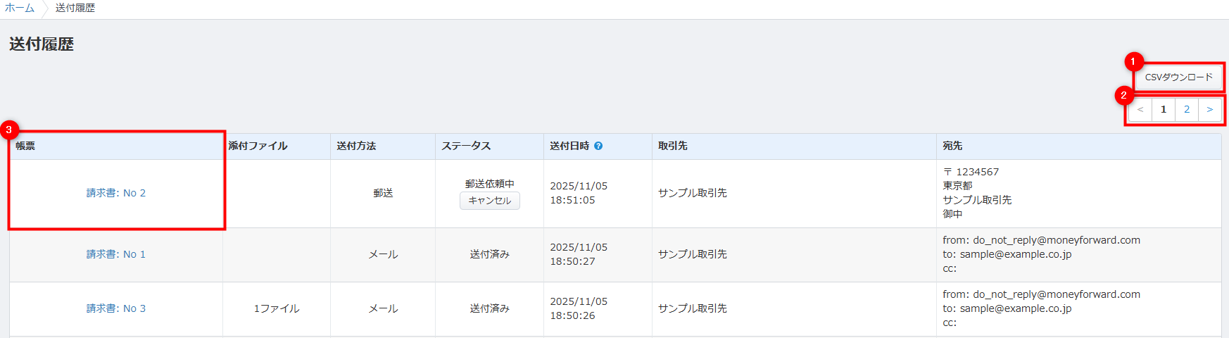 | ① | CSVダウンロード | クリックすると、送付履歴をCSVファイルでダウンロードできます。 |