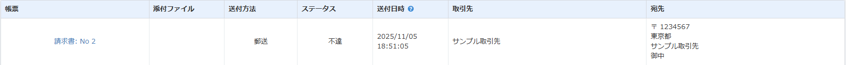 「不達」ステータスの帳票は、発送した帳票が郵送代行業者へ返送されてきた状態です。