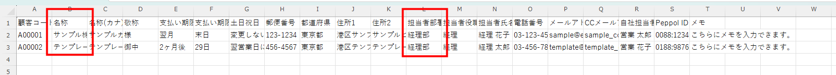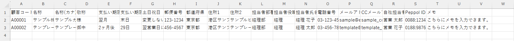 - サンプルCSVの形式に沿って取引先情報を入力し、CSVファイルを保存します。