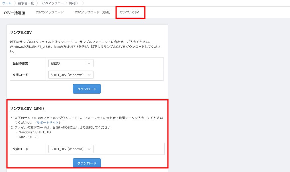「サンプルCSV」画面に「サンプルCSV(取引)」の項目を追加