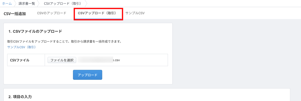 見積書・納品書・請求書の「CSV一括追加」画面に「CSVアップロード(取引)」タブを新設します。