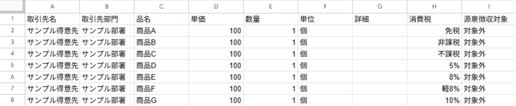 「サンプルCSV(取引)」では、取引を管理するためのサンプルCSVファイルをダウンロードできるようになります。