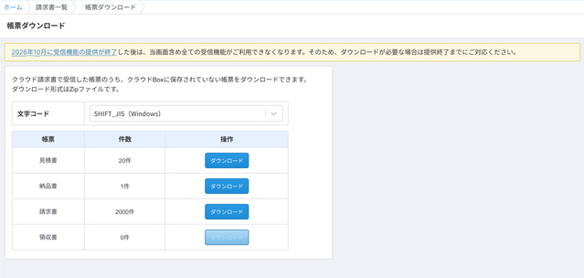 • 受信した過去の帳票をまとめてダウンロードする機能は、「受信」機能とともに、2026年10月に提供を終了する予定です。