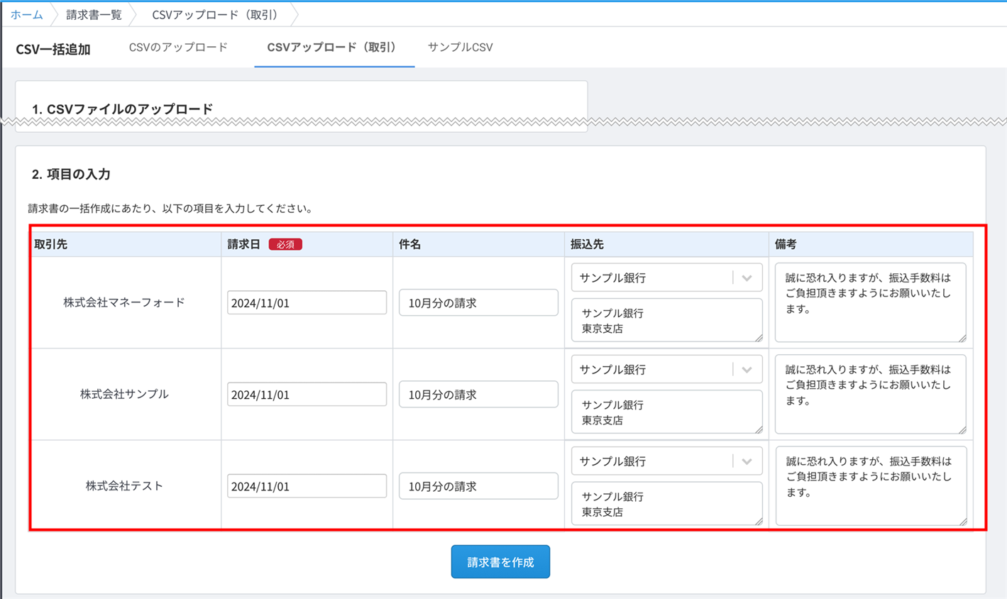 「CSVアップロード(取引)」タブでは、「サンプルCSV」画面の「サンプルCSV(取引)」でダウンロードしたCSVファイルをアップロードすることで、帳票を一括で作成できるようになります。