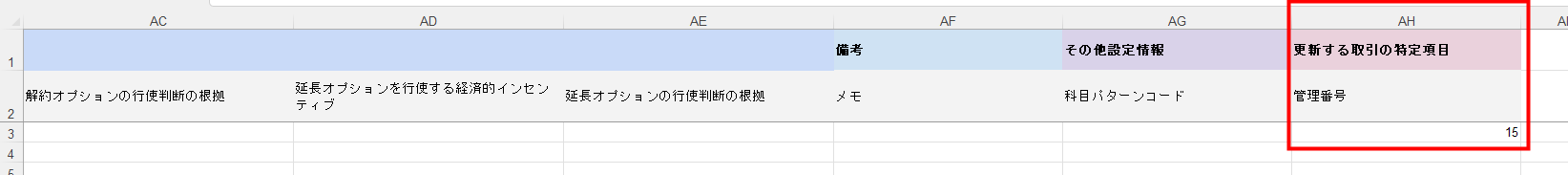 | 更新する取引の特定項目/td> | AH列 | 管理番号 | 空欄にするか、「リース台帳」画面に登録されている未承認取引の管理番号を入力できます。