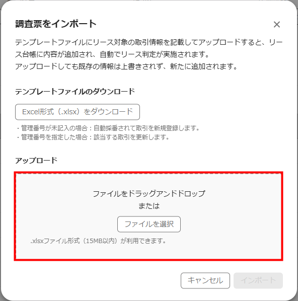 「調査票をインポート」画面で「ファイルを選択」をクリックしてファイルを選択するか、ファイルをドラッグ&ドロップします。