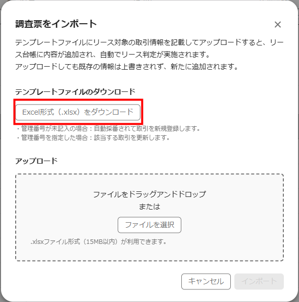 「調査票をインポート」画面で「Excel形式(.xlsx)をダウンロード」をクリックします。