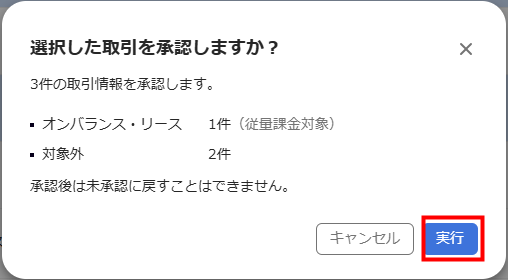 - 「選択した取引を承認しますか?」画面で内容を確認し、問題がなければ「実行」をクリックします。