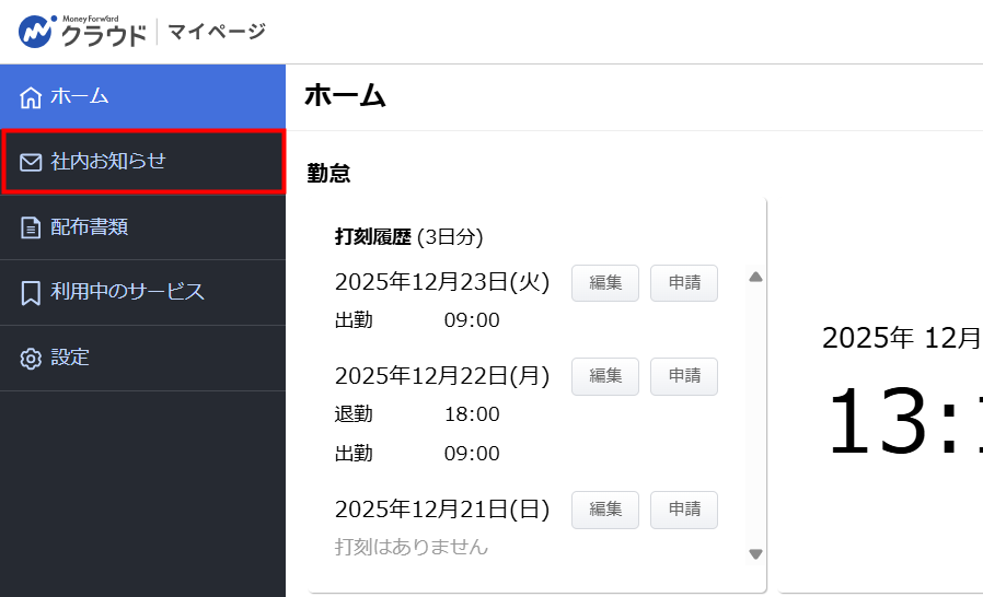 1. ホーム」画面を開き、左メニューの「社内お知らせ」をクリックします。