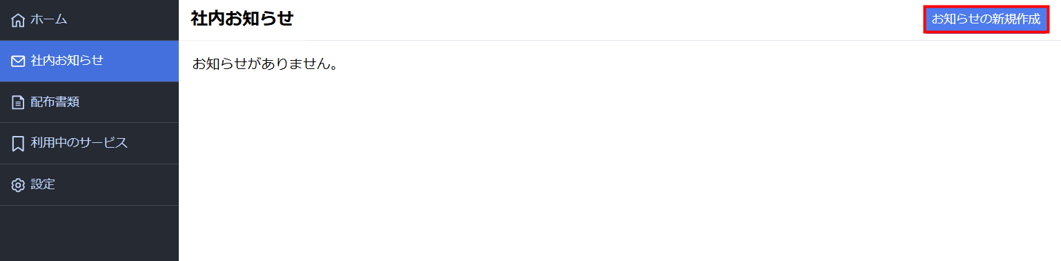 2. 社内お知らせ」画面右上の「お知らせの新規作成」をクリックします。
