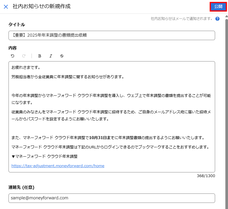 3. 「社内お知らせの新規作成」画面で必要事項を入力し、「公開」をクリックします。