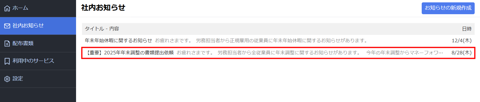 2. 社内お知らせ」画面で編集するお知らせをクリックします。
