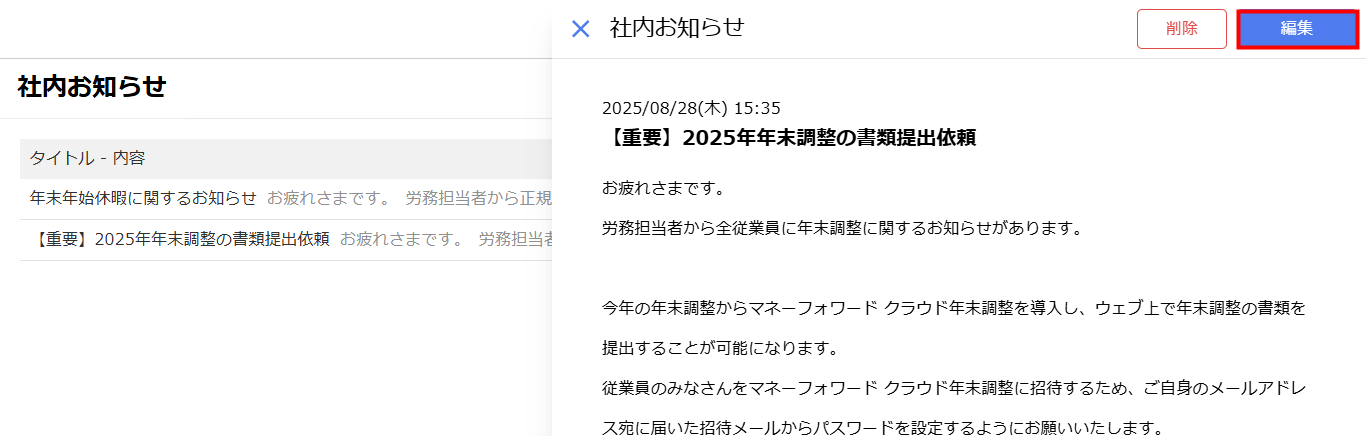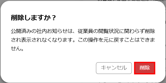 「削除」をクリックすると、該当のお知らせは削除され、従業員が閲覧できなくなります。