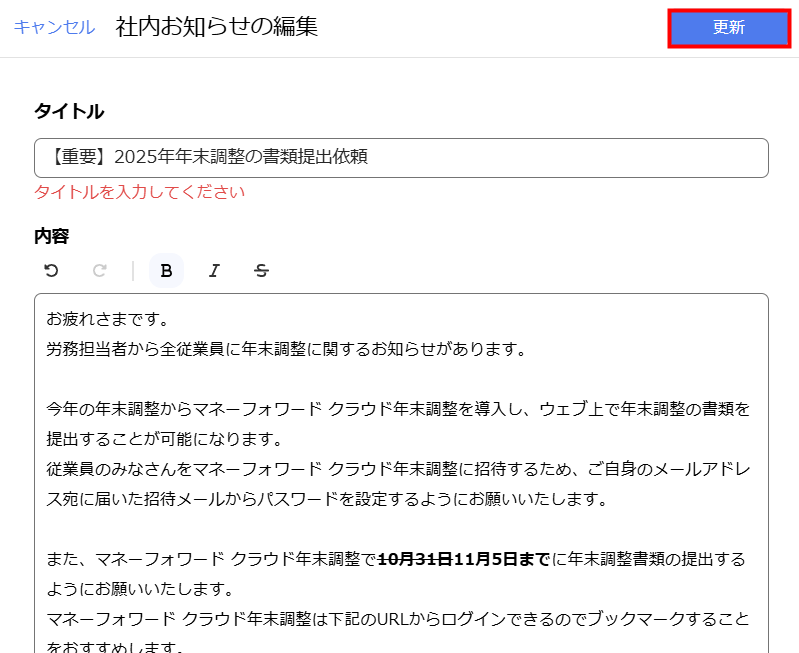 4. 「社内お知らせの編集」画面で内容を編集し、「更新」をクリックします。