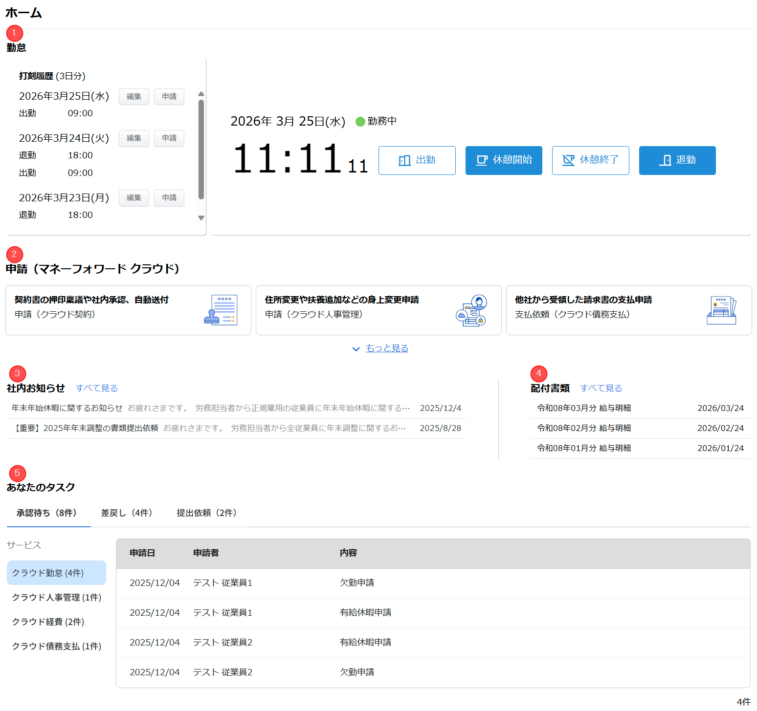 | ① | 勤怠 | 勤怠の打刻や打刻履歴を確認できます。 詳細はこちらの項をご参照ください。 |