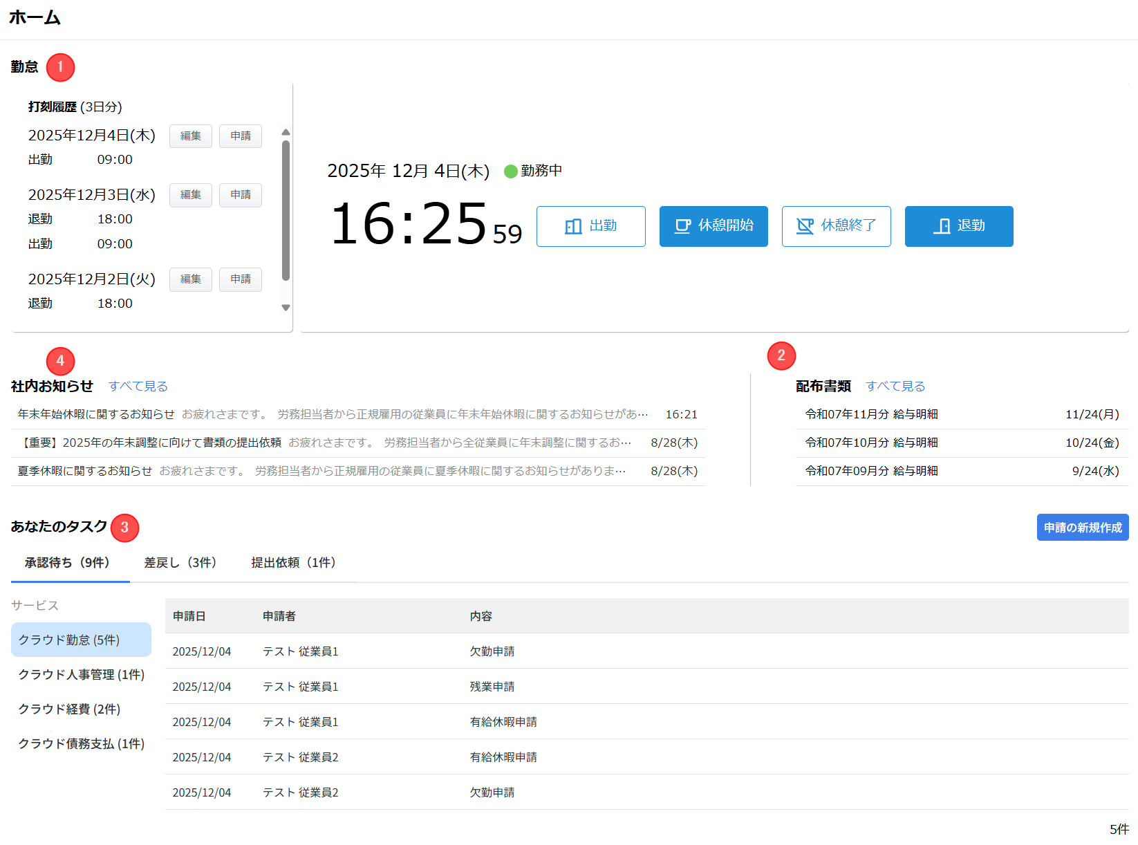 | ③ | あなたのタスク | 「承認待ち」「差戻し」「提出依頼」タブを切り替えて自身のタスクを確認できます。 「申請書の新規作成」をクリックすることで、申請の作成も可能です。 詳細はこちらの項をご参照ください。 |