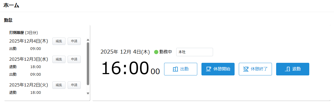 「勤怠」では、勤怠の打刻や過去3日分の打刻履歴の確認が行えます。