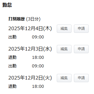 「打刻履歴」では、過去3日分の打刻履歴について、打刻の種類や時間を確認できます。
