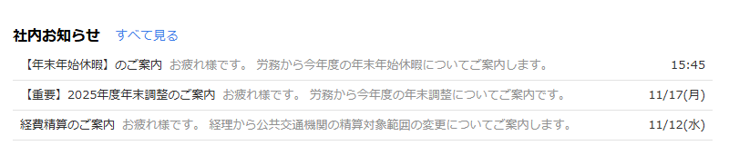 また、「すべて見る」をクリックすると、「社内お知らせ」画面で過去に公開されたすべての社内お知らせを確認できます。