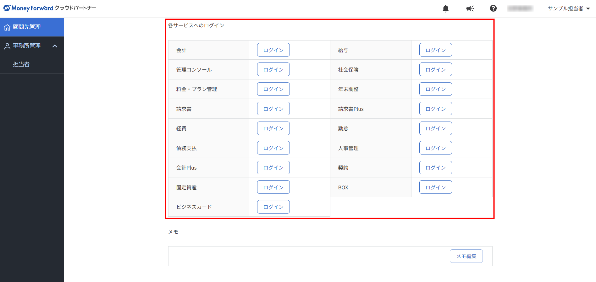 マネーフォワード クラウドパートナーで管理可能な4つのサービスでは、「顧問先管理」画面から顧問先の事業者にログインすることができます。