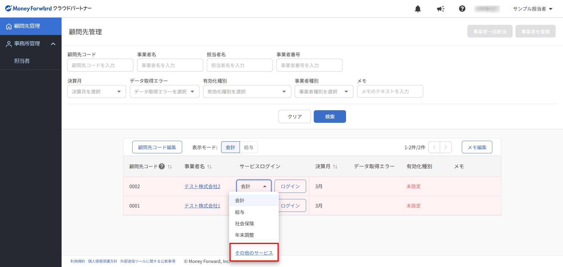 - 「顧問先管理」画面で顧問先の「サービスログイン」欄にあるプルダウンをクリックし、「その他のサービス」を選択します。