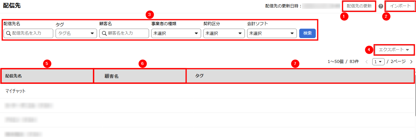 | ③ | 検索条件 | 「配信先名」「タグ」「顧客名」「事業者種別」「契約区分」「会計ソフト」を指定して、配信先を絞り込み検索できます。 |