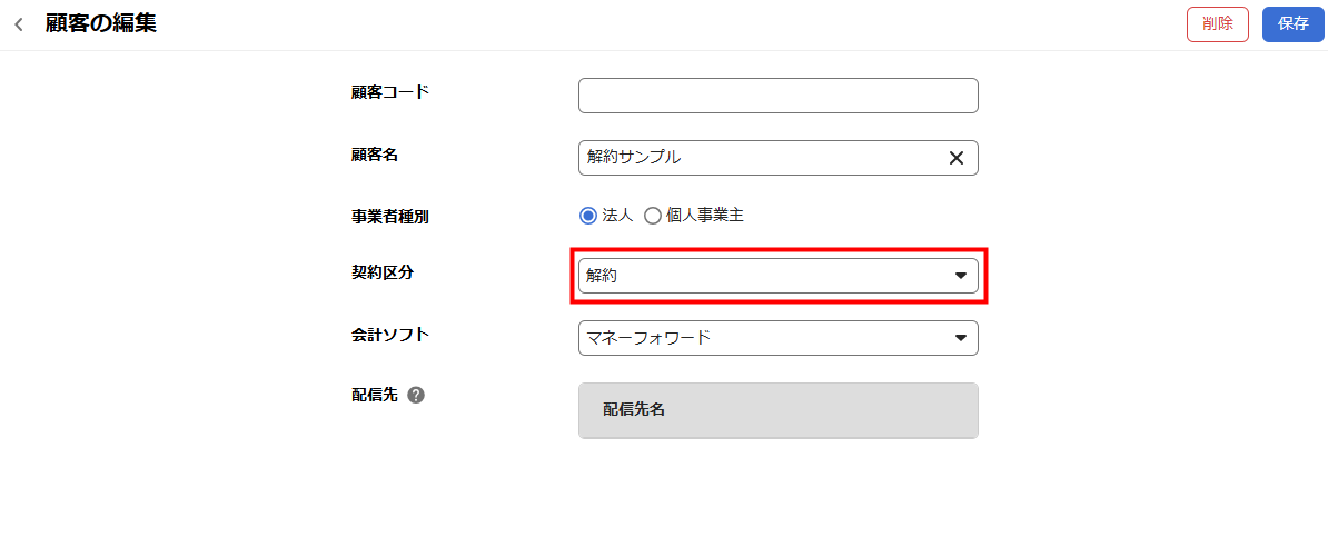 解約済みの顧客を配信対象外にする場合は、「顧客」画面で該当の顧客をクリックし、「契約区分」を「解約」に変更してください。