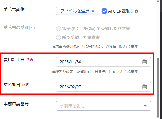 本項では、設定条件の場合を例に、手動入力時とOCR入力時における「費用計上日」の反映内容について説明します。