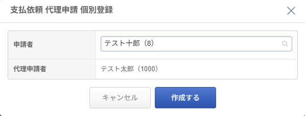 以降の手順は、「個別登録」を選択した場合を例にご説明します。 - 「支払依頼 代理申請 個別登録」画面の「申請者」で被代理人となる従業員を選択し、「作成する」をクリックします。