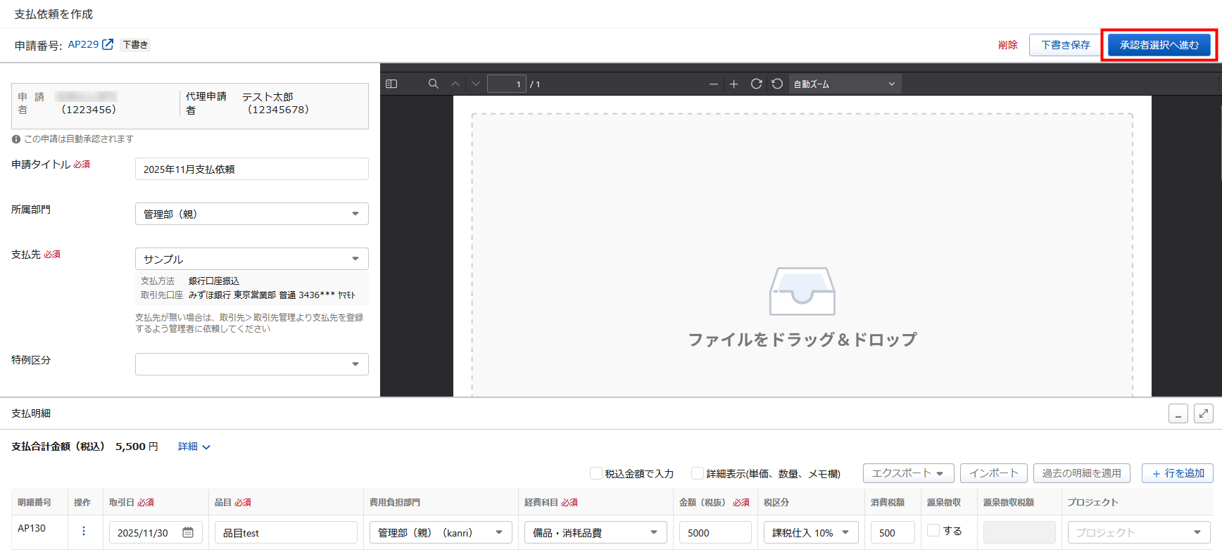 - 支払依頼を代理作成し、画面右上の「承認者選択へ進む」をクリックします。