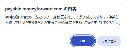 - 「経理業務」>「電子帳簿保存法書類」>「タイムスタンプ検証結果」をクリックします。