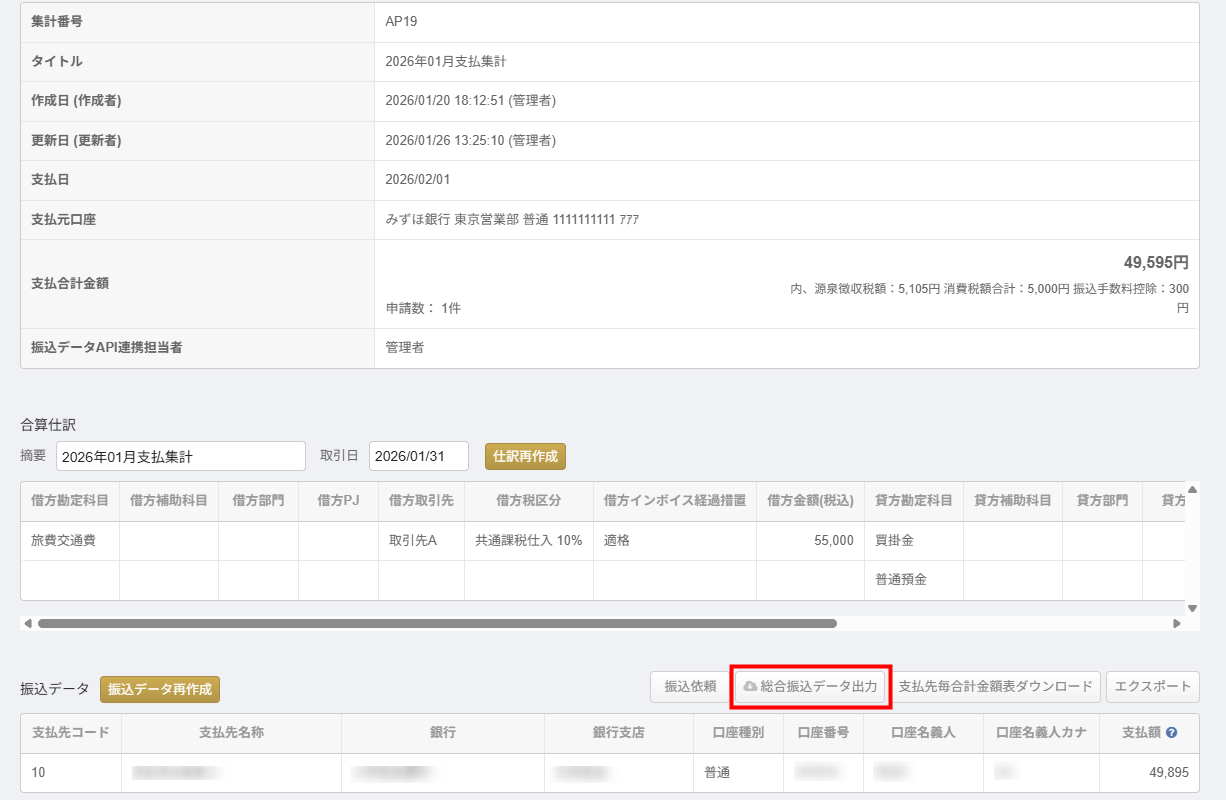 集計(支払処理) - 作成した集計内の「振込データ」項目に表示されている「総合振込データ出力」をクリックします。