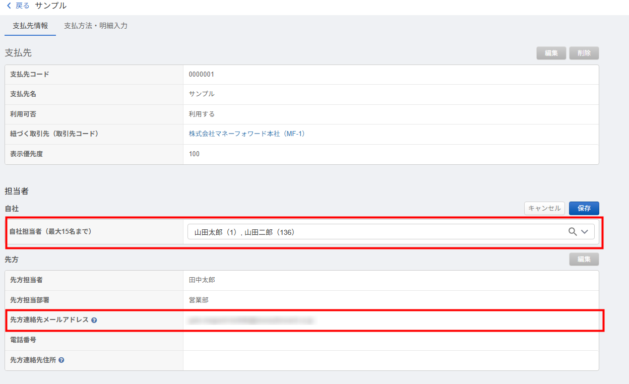支払先の「支払先情報」画面では、以下の項目を必ず設定してください。